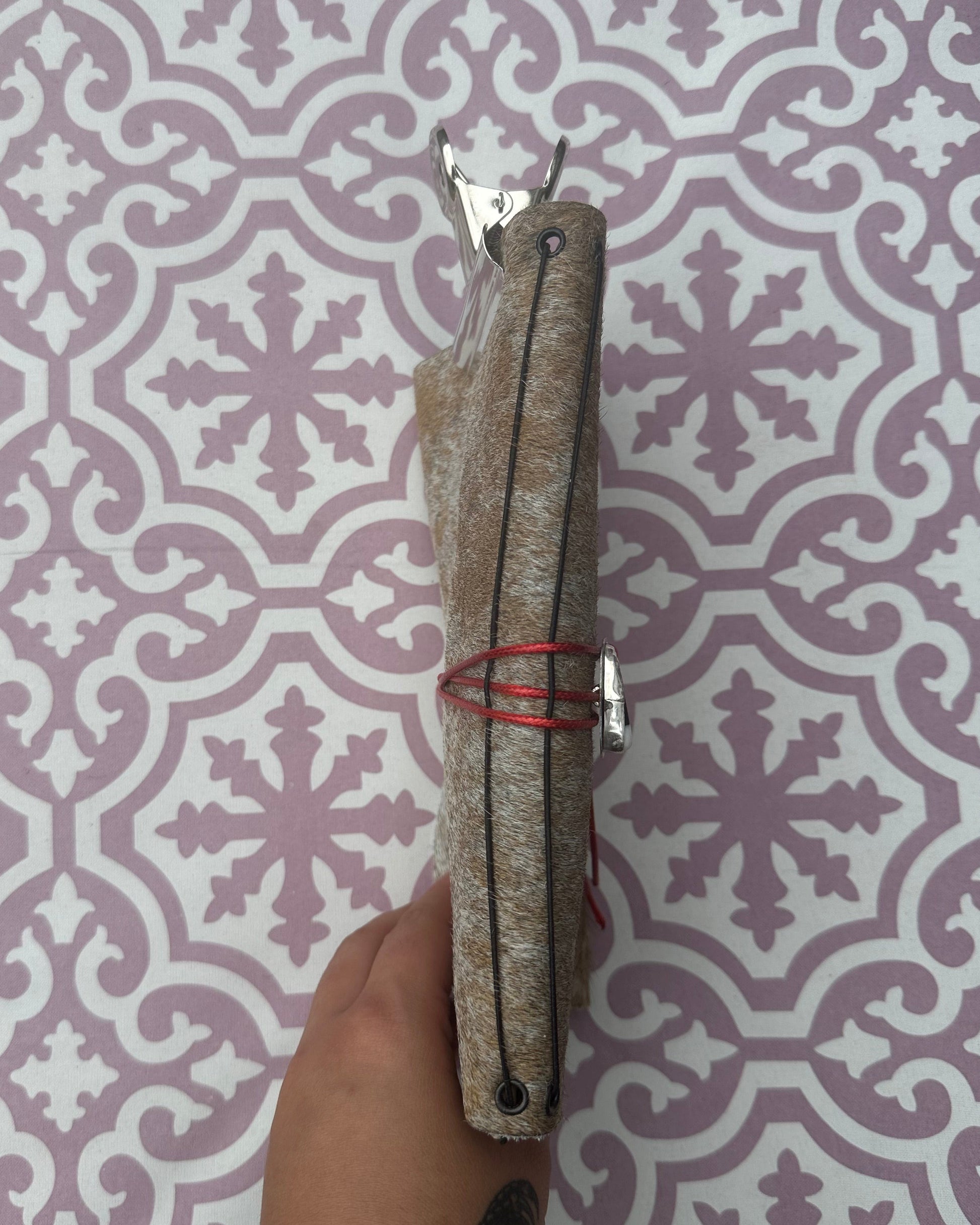 She comes with: two elasticated holders with potential to add more. A lengthy rope to close (allowing for bulkage and growth ((Not attached))- embellished with a Burnished Studios 'pendant' made of 925 sterling silver and a Zebra Jasper stone. A large binder clip to hold open the pages that need a little extra time to dry. A smaller paper clip to hold any necessary added extras to the cow herself. And ONE A5 sized blank page book (Again, this journal cover allows for extra added A5 journal books).